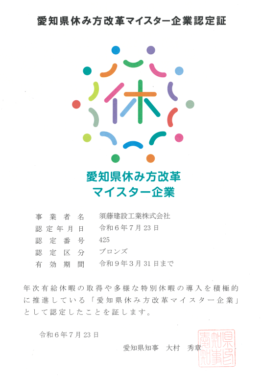 当社は、「愛知県休み方改革マイスター企業」の認定を受けました。