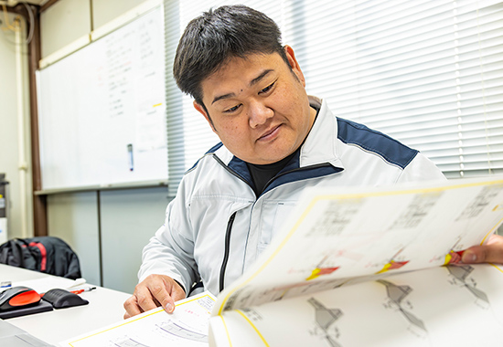 入社後に土木施工管理技士を取得し、今は主任として現場を任されています。主な現場は豊田市内に流れる河川の護岸工事で、両方の川幅を徐々に広げて水害を防ぐとても重要な工事です。受注後は図面や設計図をもとに現場調査や測量を行い、協力会社を選定して施工計画書を作成。役所の許可が出たら工事が始まります。