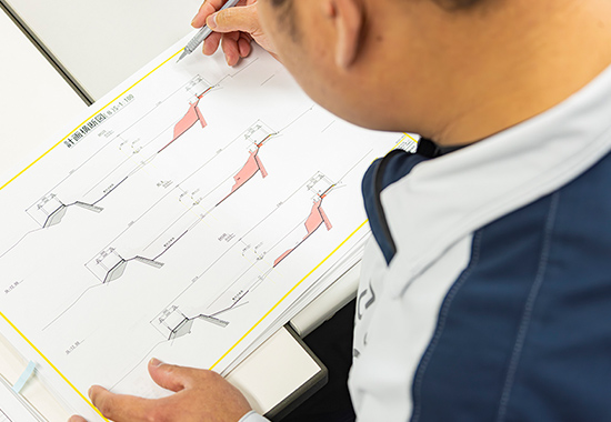 現場の状況によって工法が変更になったり、追加工事が発生すると、その都度、役所とすり合わせや予算交渉を行います。雨で増水すれば土や材料が流されてやり直しになる可能性があるので天気予報のチェックは毎日欠かせません。雨が多い7月8月は不安になることもありますね。工事の進捗や仕上がり状態を資料にまとめて完了検査が終われば終了です。完成後、きれいに仕上がった現場をぐるりと見渡すと、「形に残る仕事」のスケールの大きさを感じます。